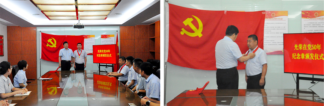 七一当天,集团本部举行了庄重而温馨的 “光荣在党 50 年” 纪念章颁发仪式。集团党委书记、董事长崔洪金亲自为一支部老党员黄柏烨、孔令奇颁发纪念章。因路途遥远未能到场,由支部党员代为领取。崔洪金书记表示,两位老党员 50 年如一日坚守初心、忠诚于党,是集团全体党员学习的榜样,希望大家以他们为标杆,传承红色精神,立足岗位担当作为。